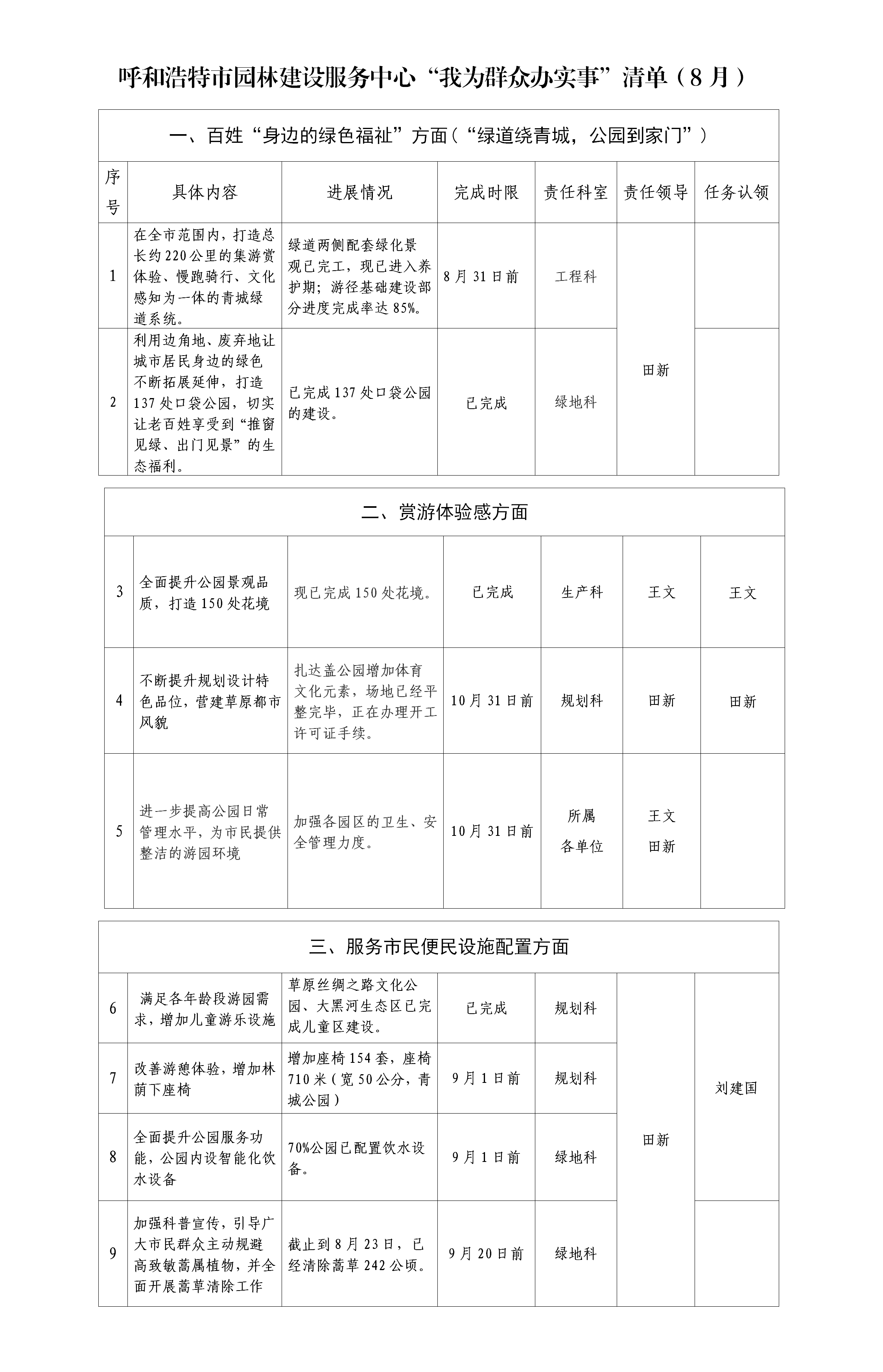 呼和浩特市园林建设服务中心“我为群众办实事”清单(8月)