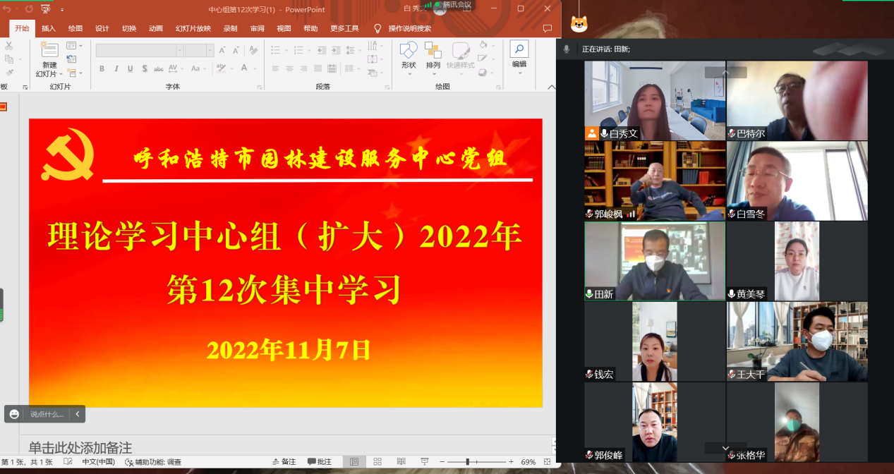 11月7日,市园林建设服务中心以视频会议的形式召开党组理论学习中心组(扩大)2022年第12次集中学习,专题学习贯彻党的二十大精神。市园林建设服务中心党组书记、主任田新同志主持会议,并领学了习近平总书记在中国共产党第二十次全国代表大会上的报告。中心党组成员、机关各科室负责人、所属单位和分支机构负责人参加了会议。