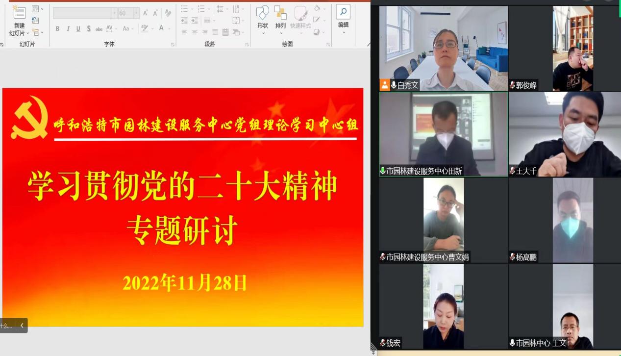 为扎实推进学习贯彻党的二十大精神走深走实,11月28日,市园林建设服务中心党组理论学习中心组召开学习贯彻党的二十大精神专题研讨会。会议由市园林建设服务中心党组书记、主任田新同志主持,党组成员结合学习领会党的二十大精神,依次进行了交流发言。
