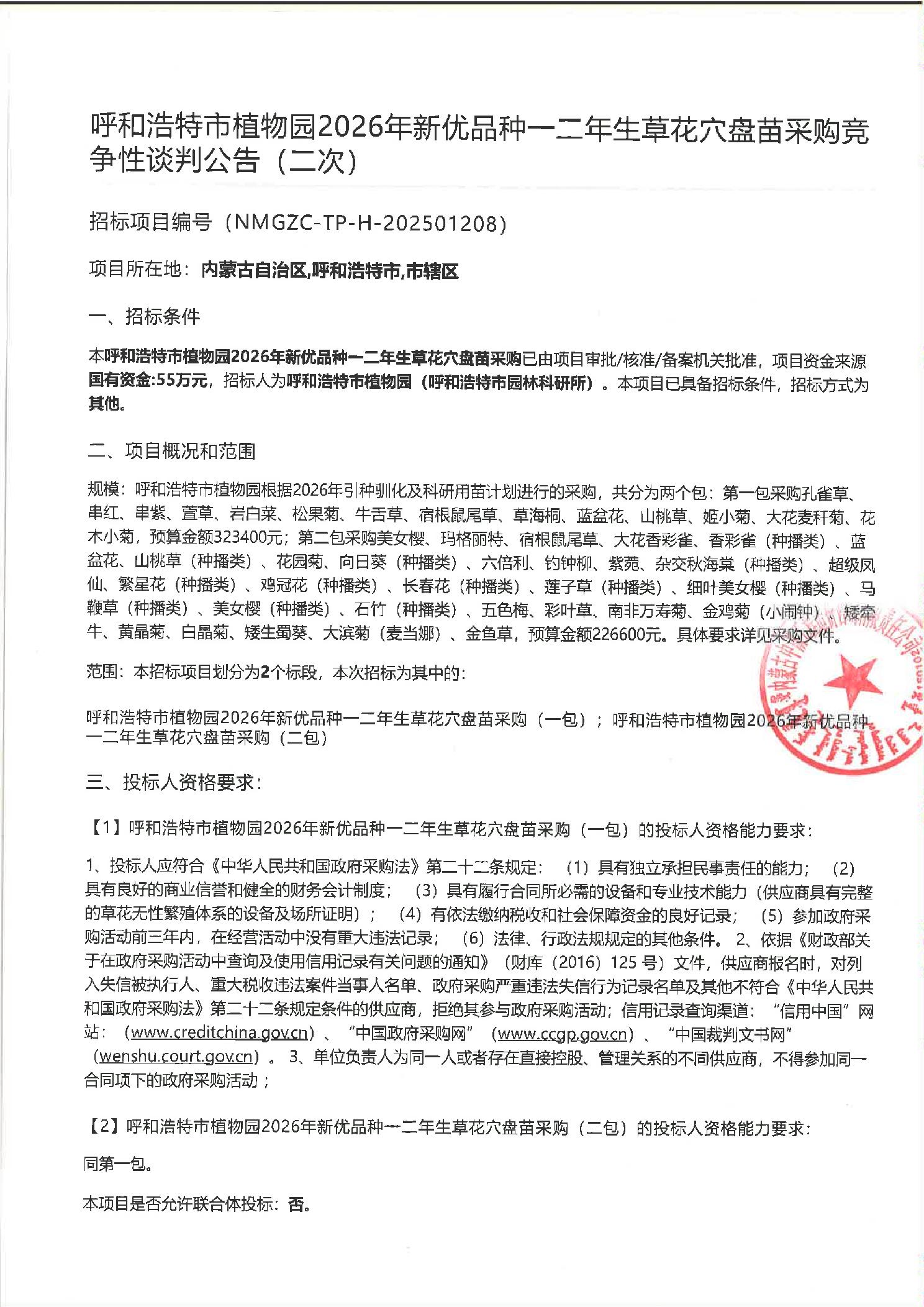 呼和浩特市植物园2026年新优品种一二年生草花穴盘苗采购竞争性谈判公告(二次)