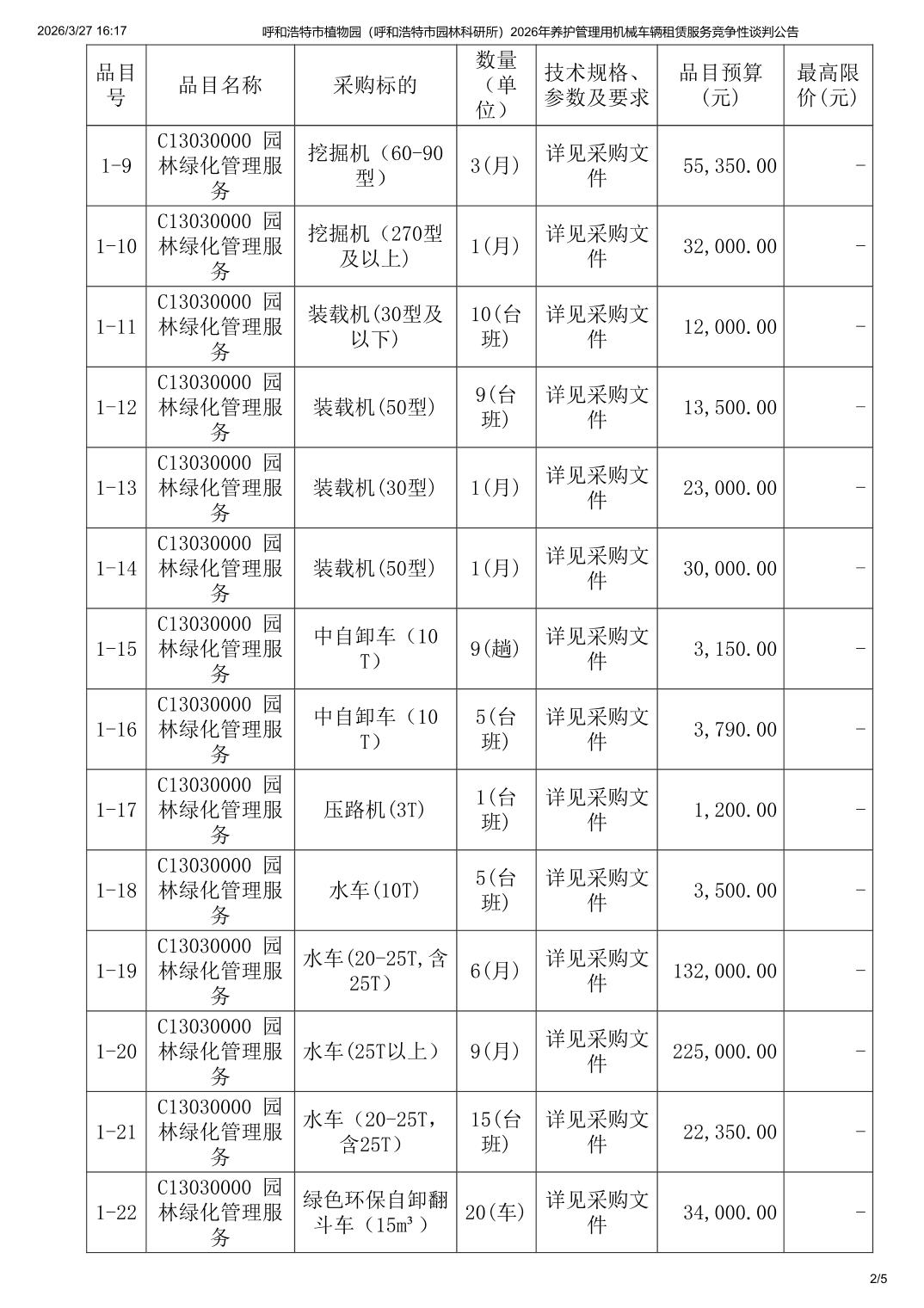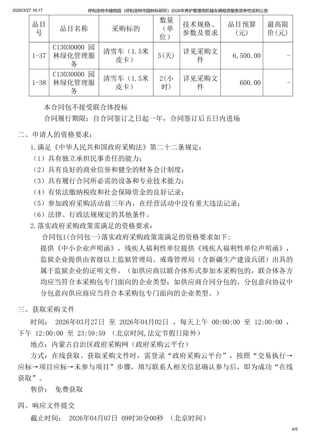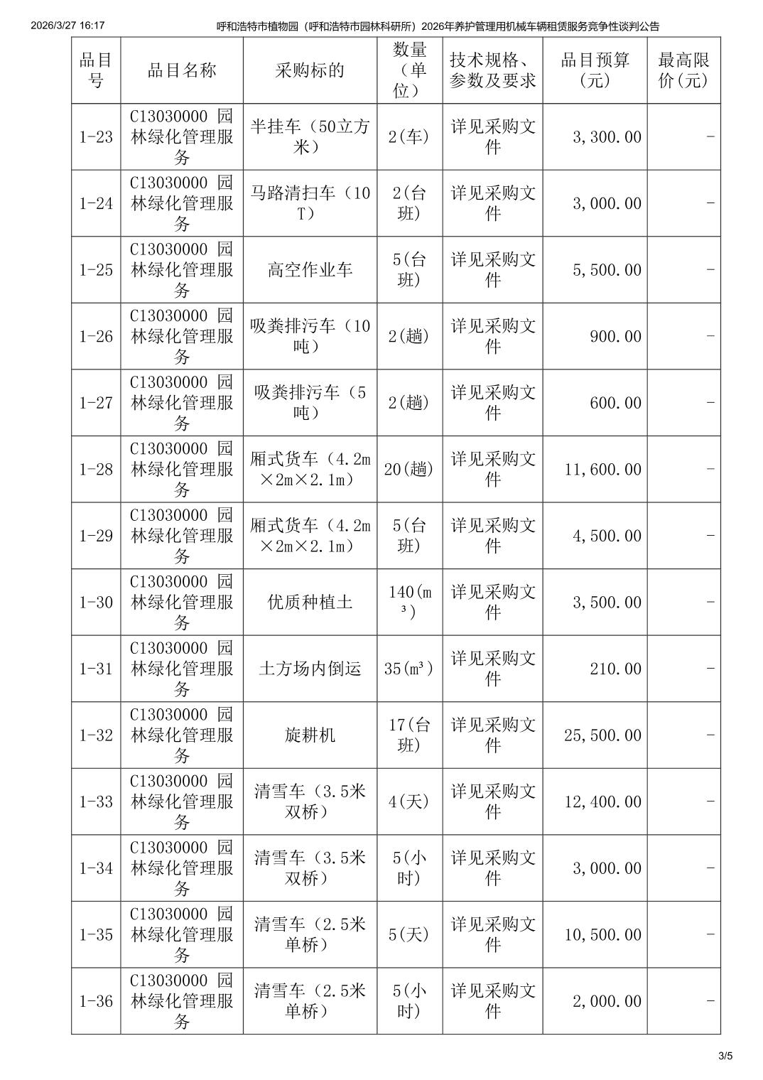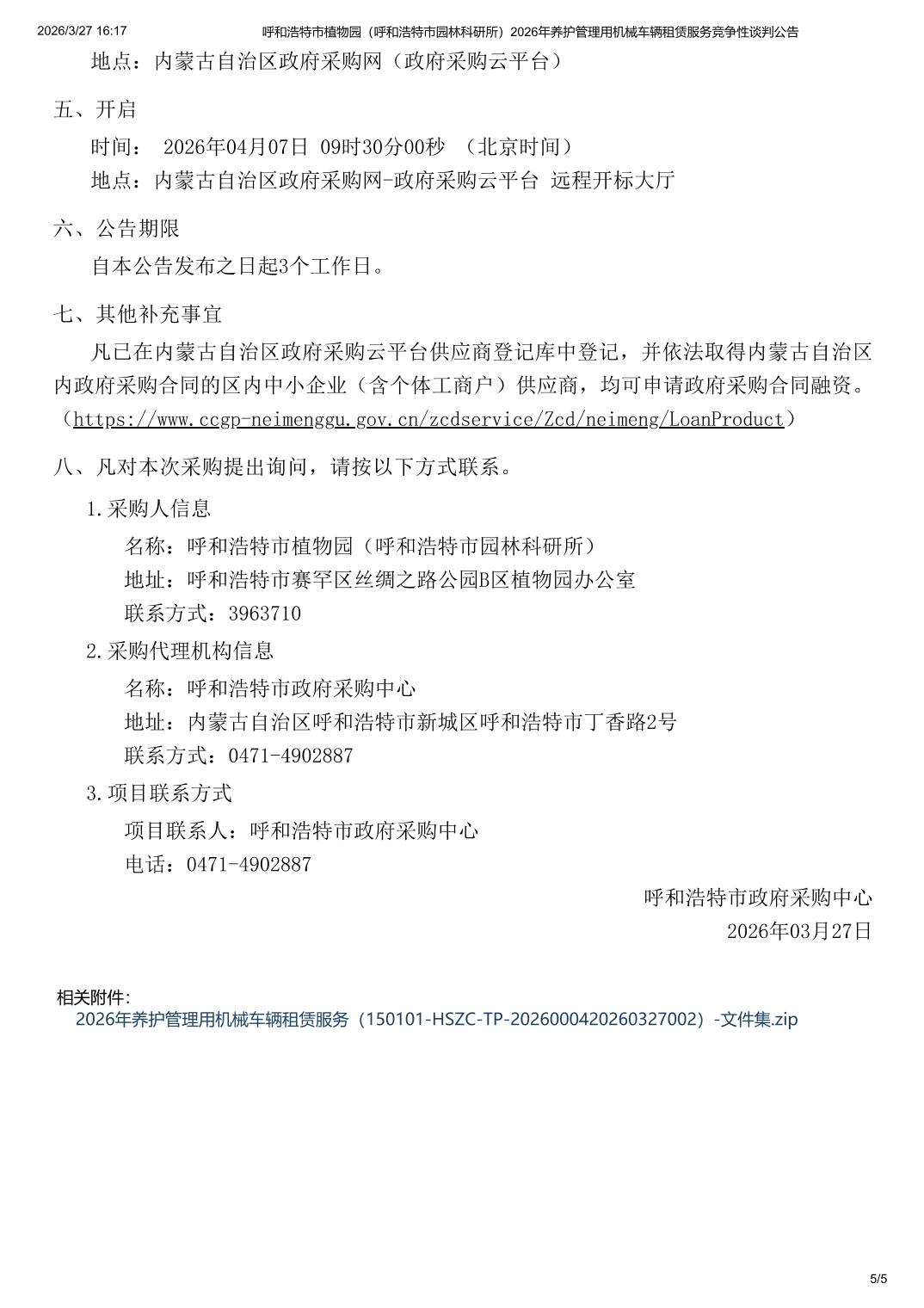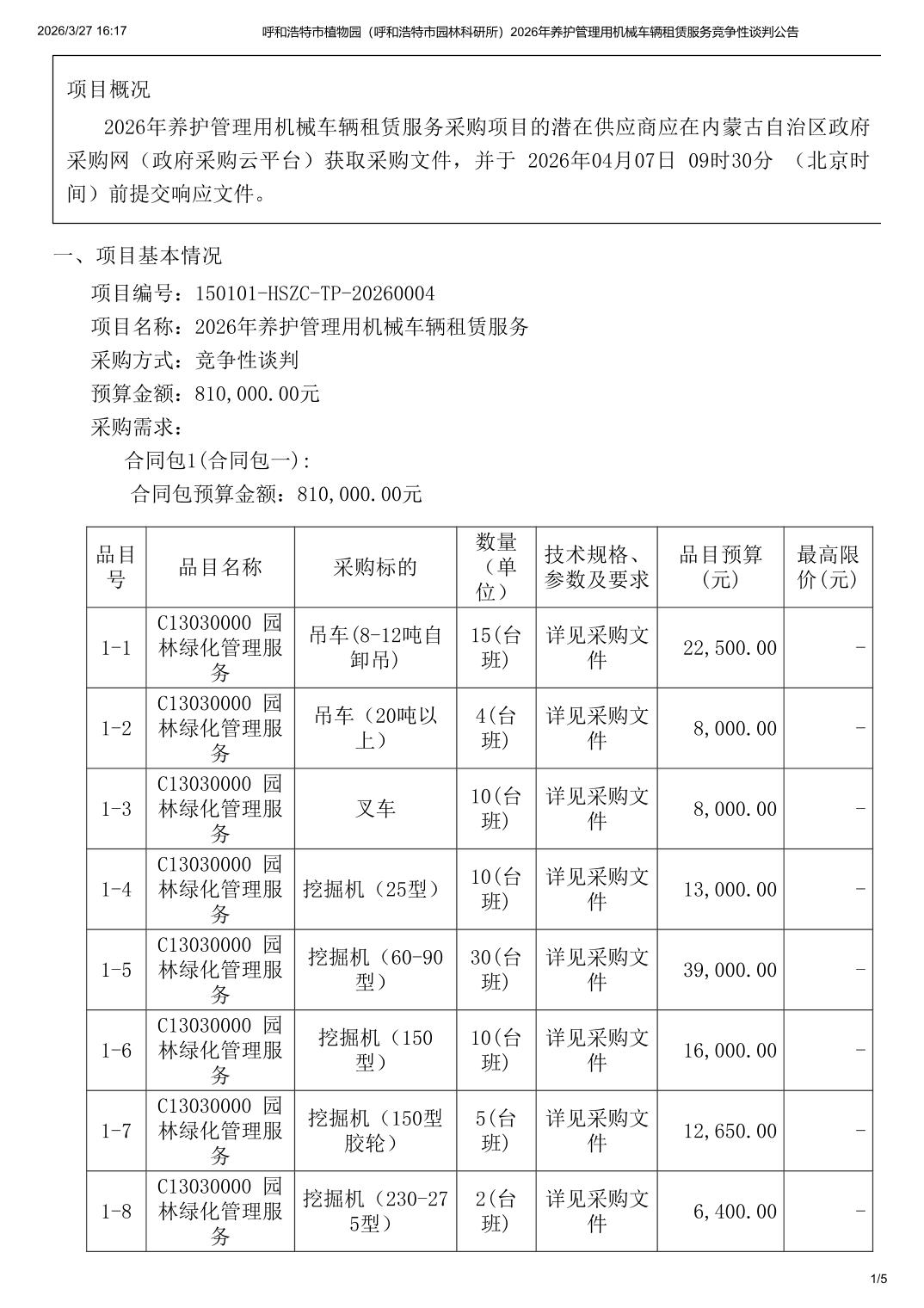 呼和浩特市植物园(呼和浩特市园林科研所)2026年养护管理用机械车辆租赁服务竞争性谈判公告