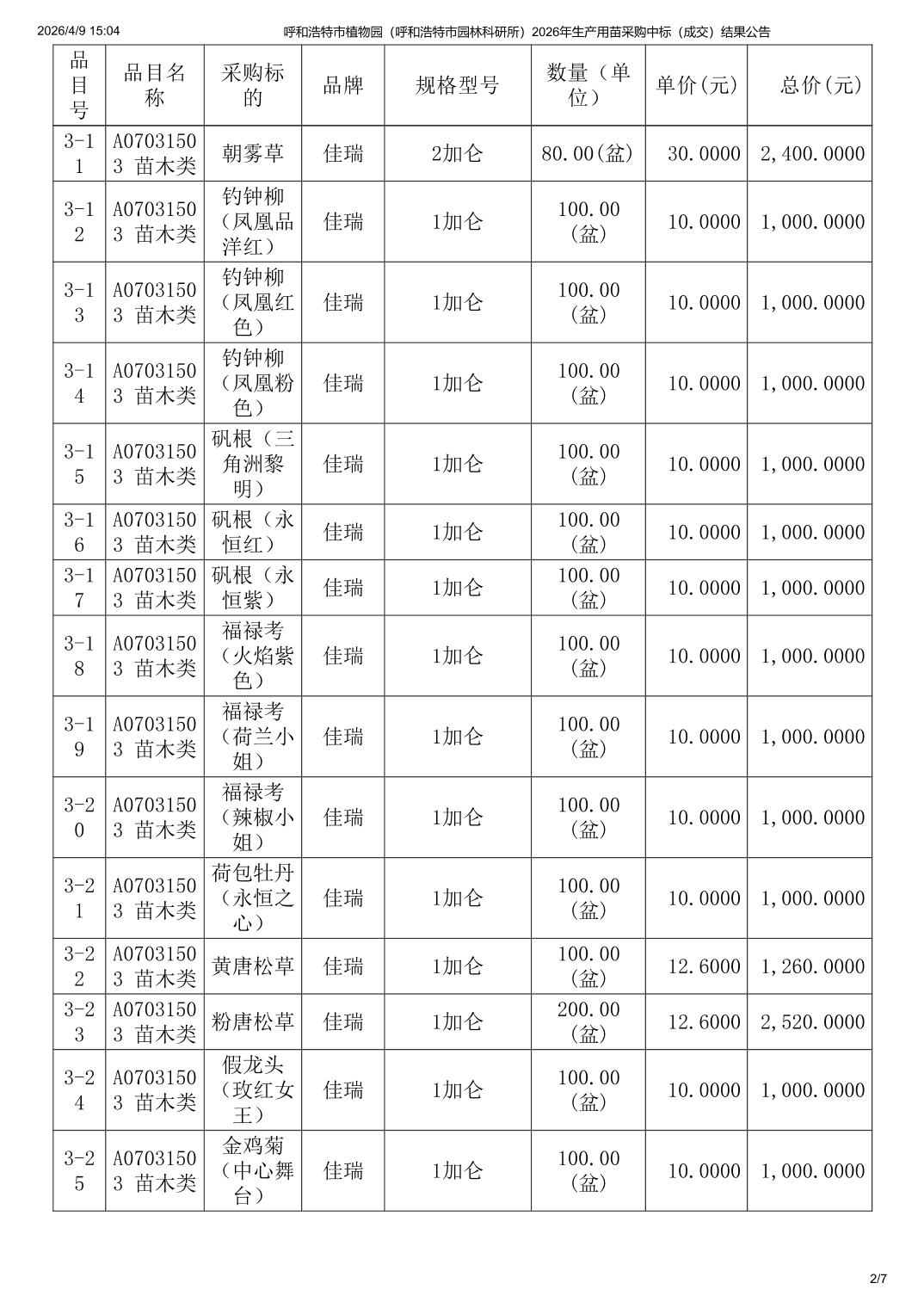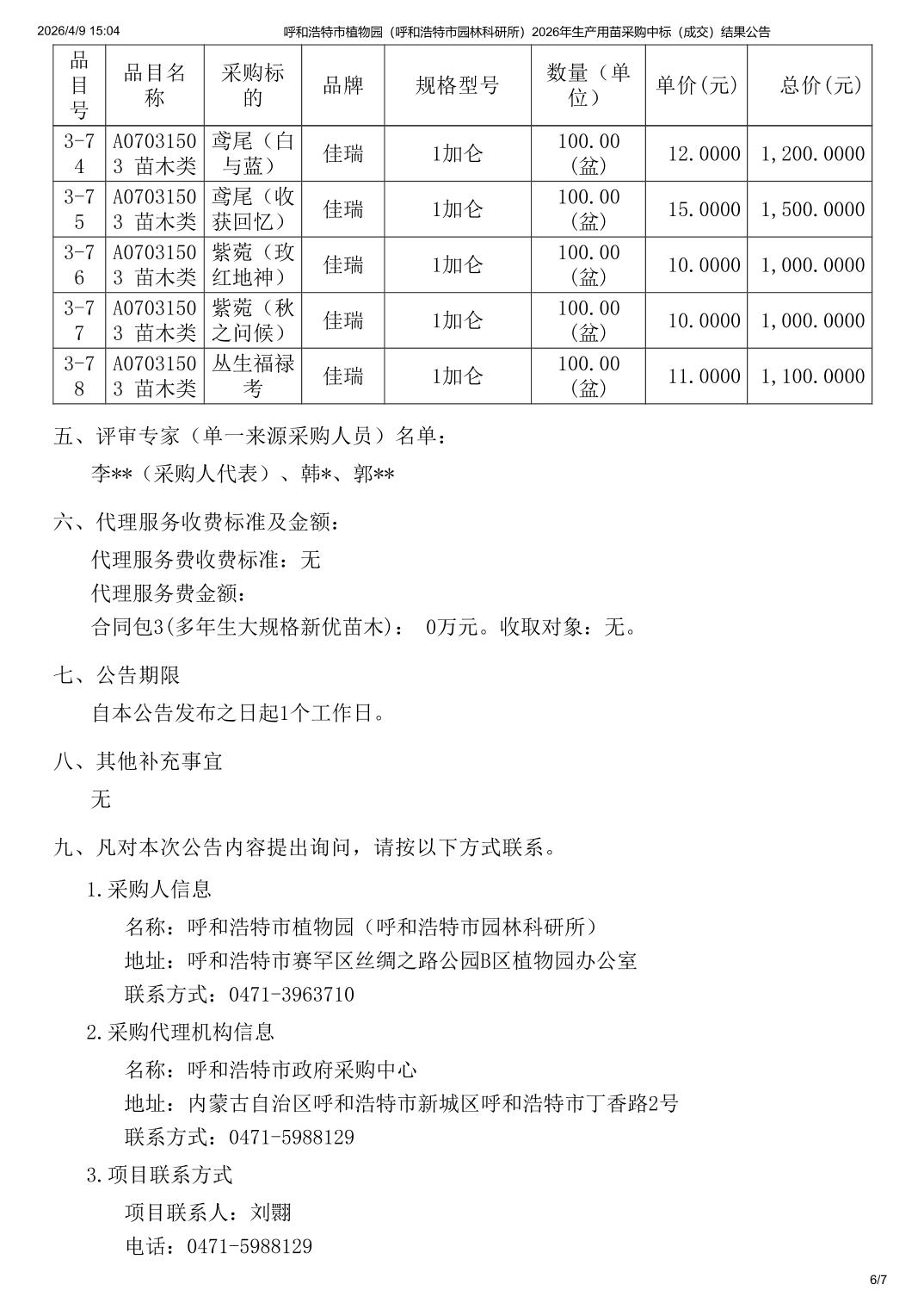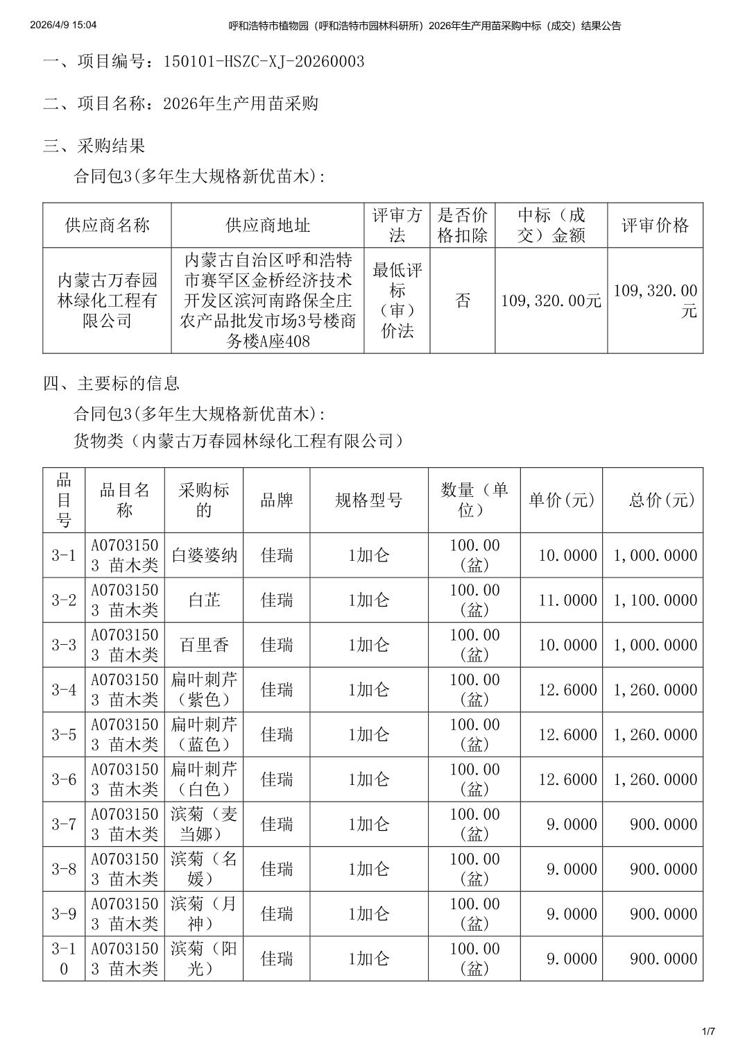 呼和浩特市植物园(呼和浩特市园林科研所)2026年生产用苗采购中标(成交)结果公告