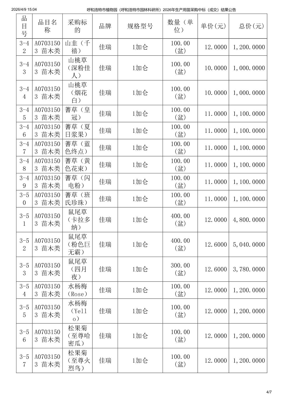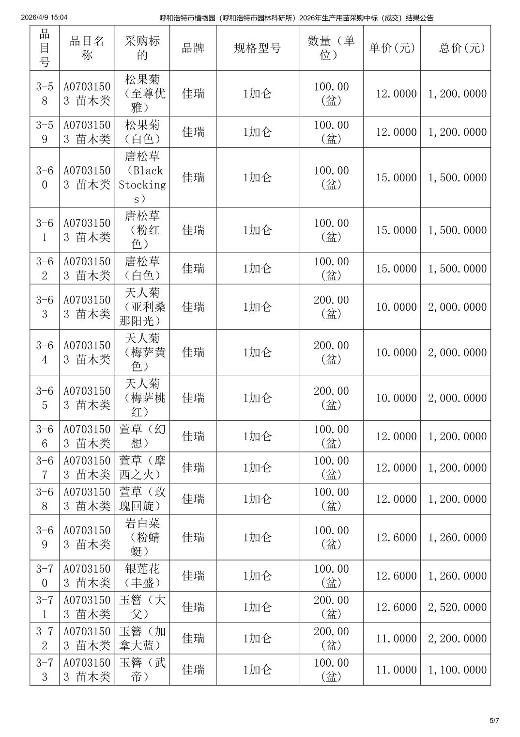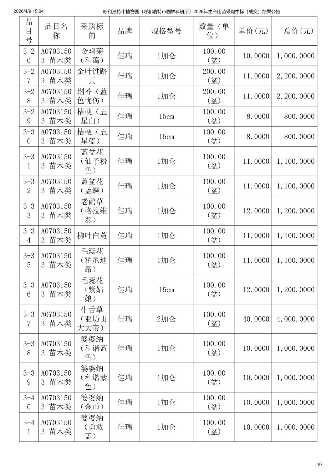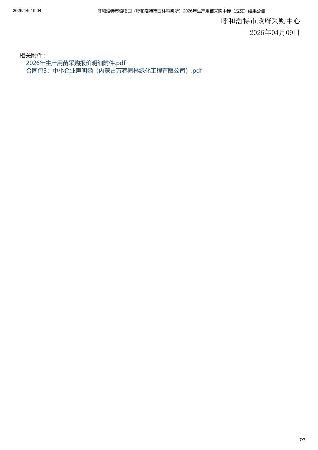 呼和浩特市植物园(呼和浩特市园林科研所)2026年生产用苗采购中标(成交)结果公告