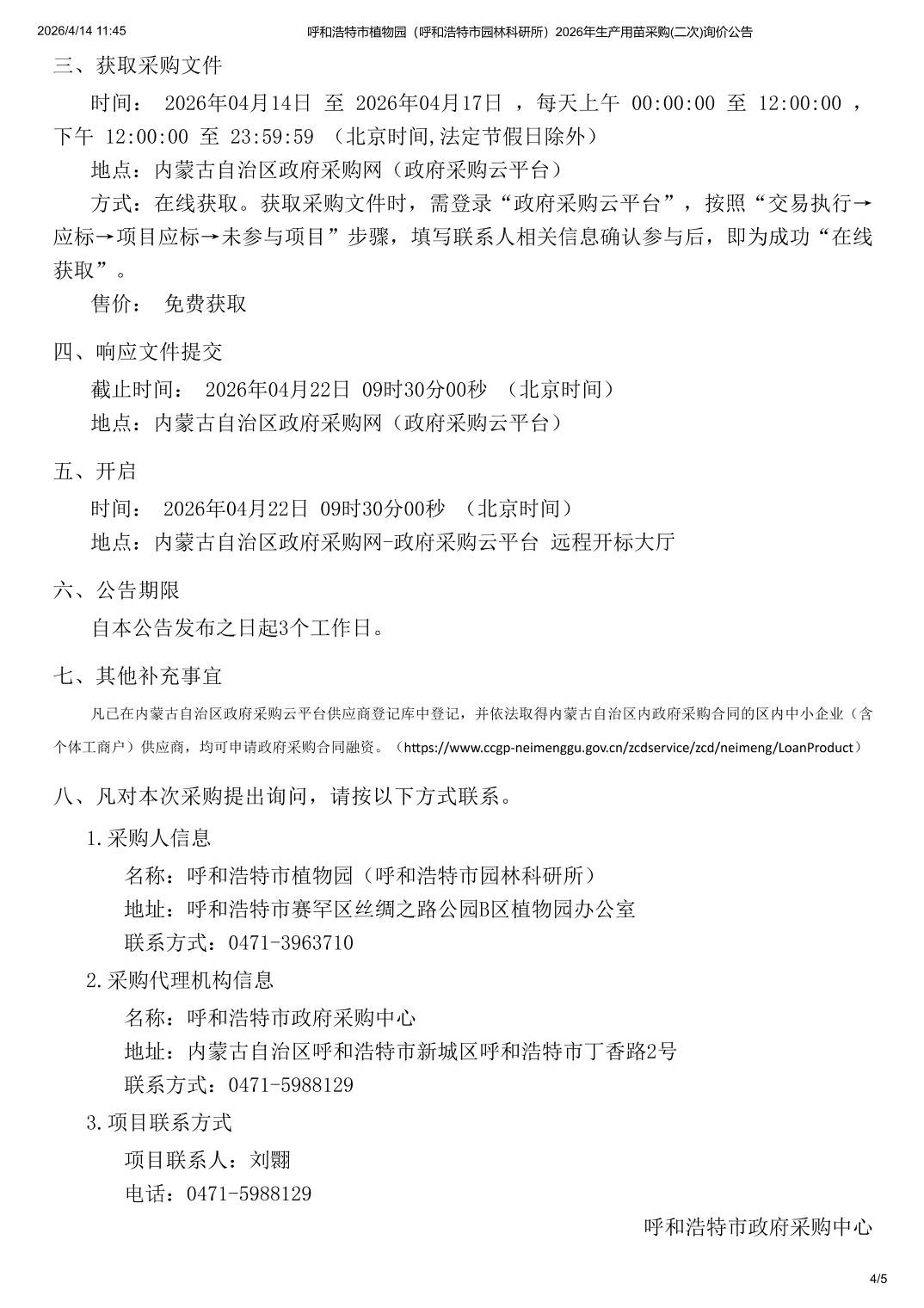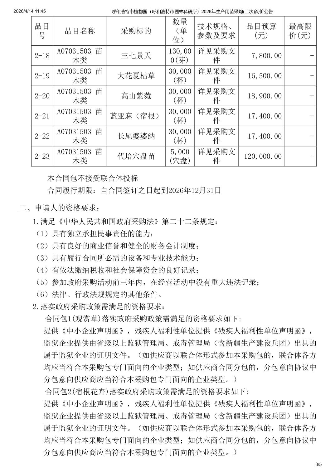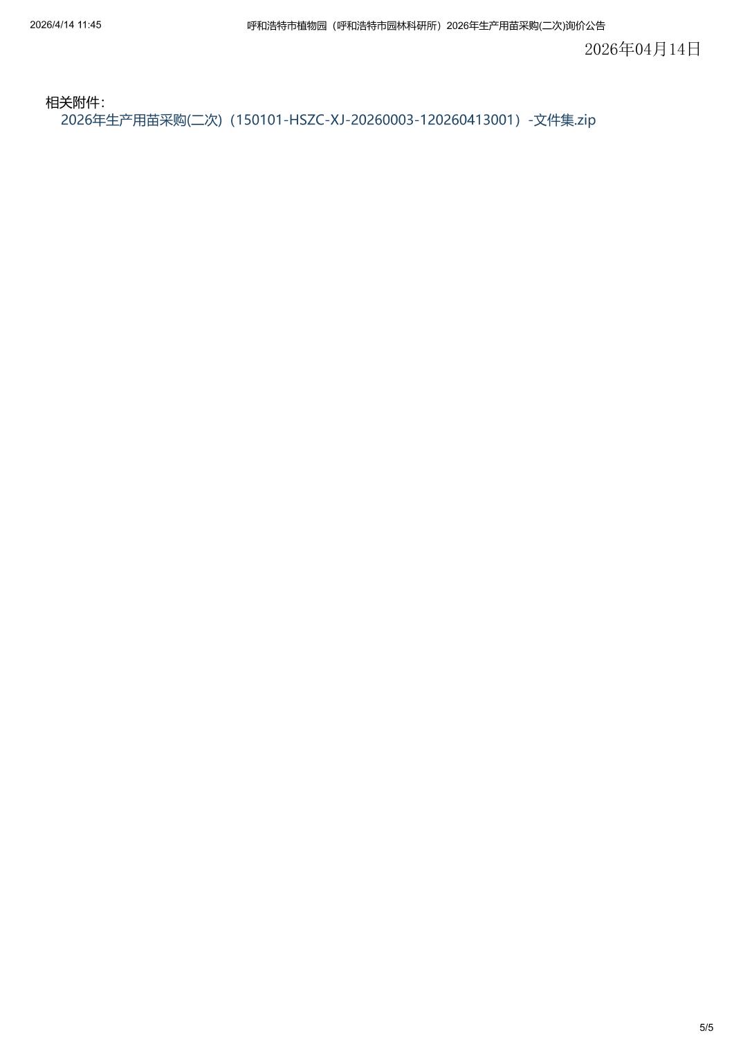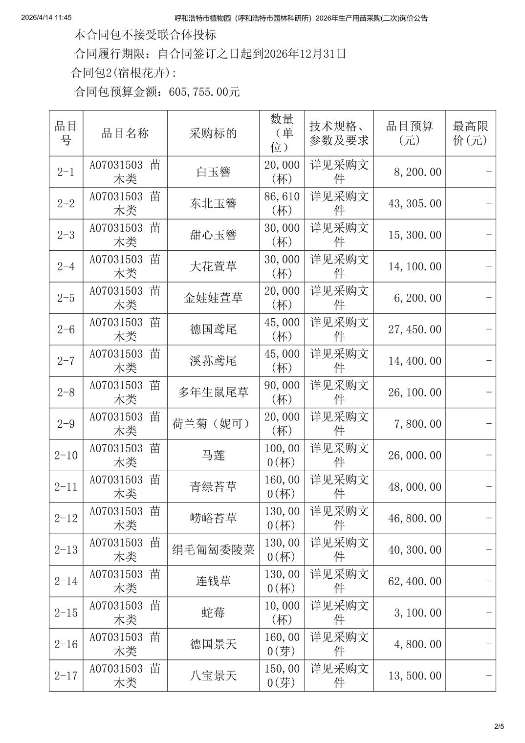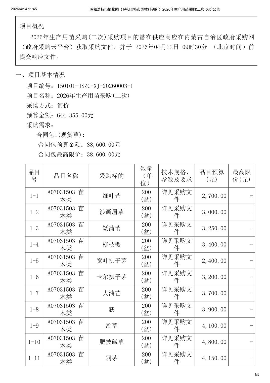 呼和浩特市植物园(呼和浩特市园林科研所)2026年生产用苗采购(二次)询价公告