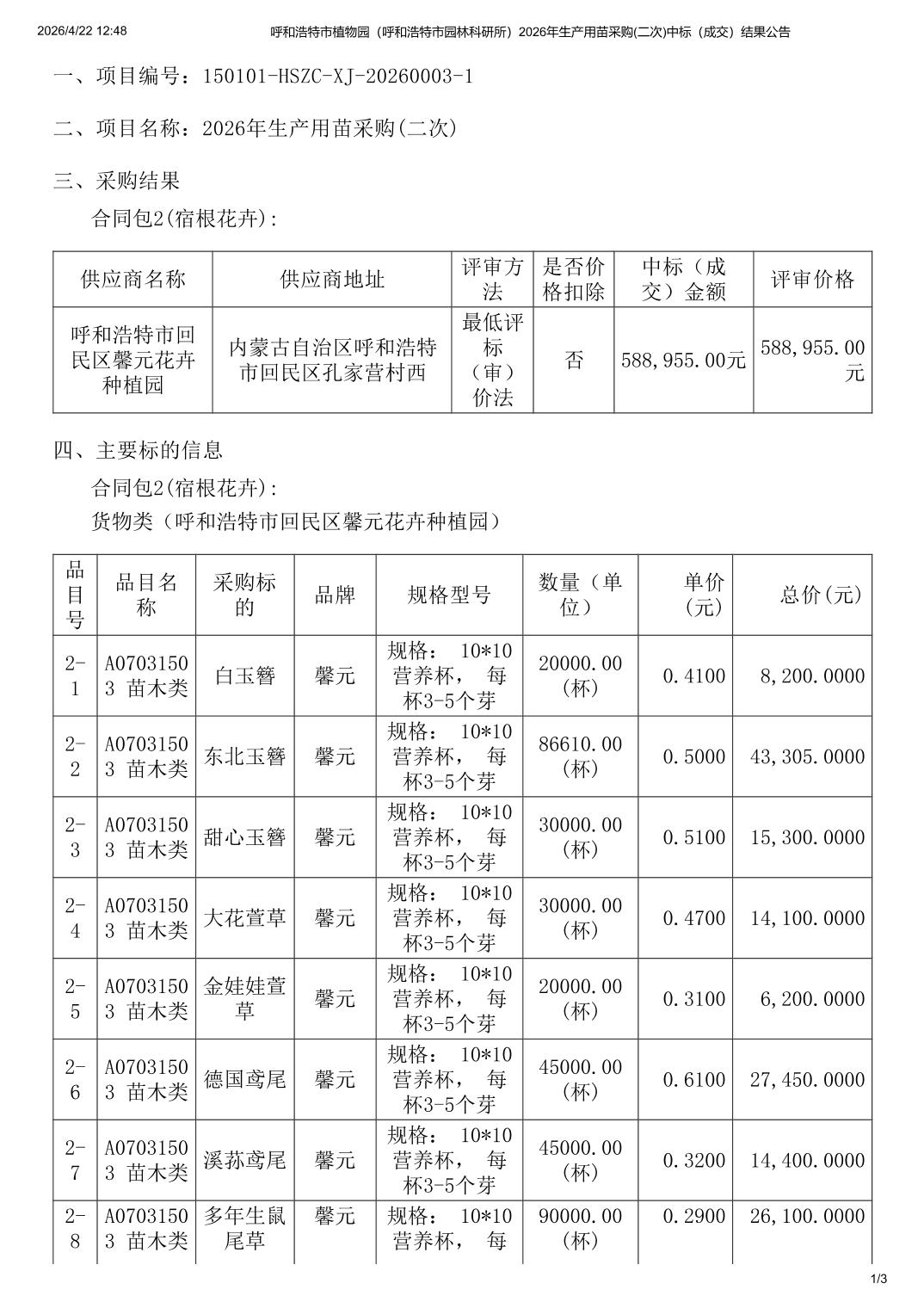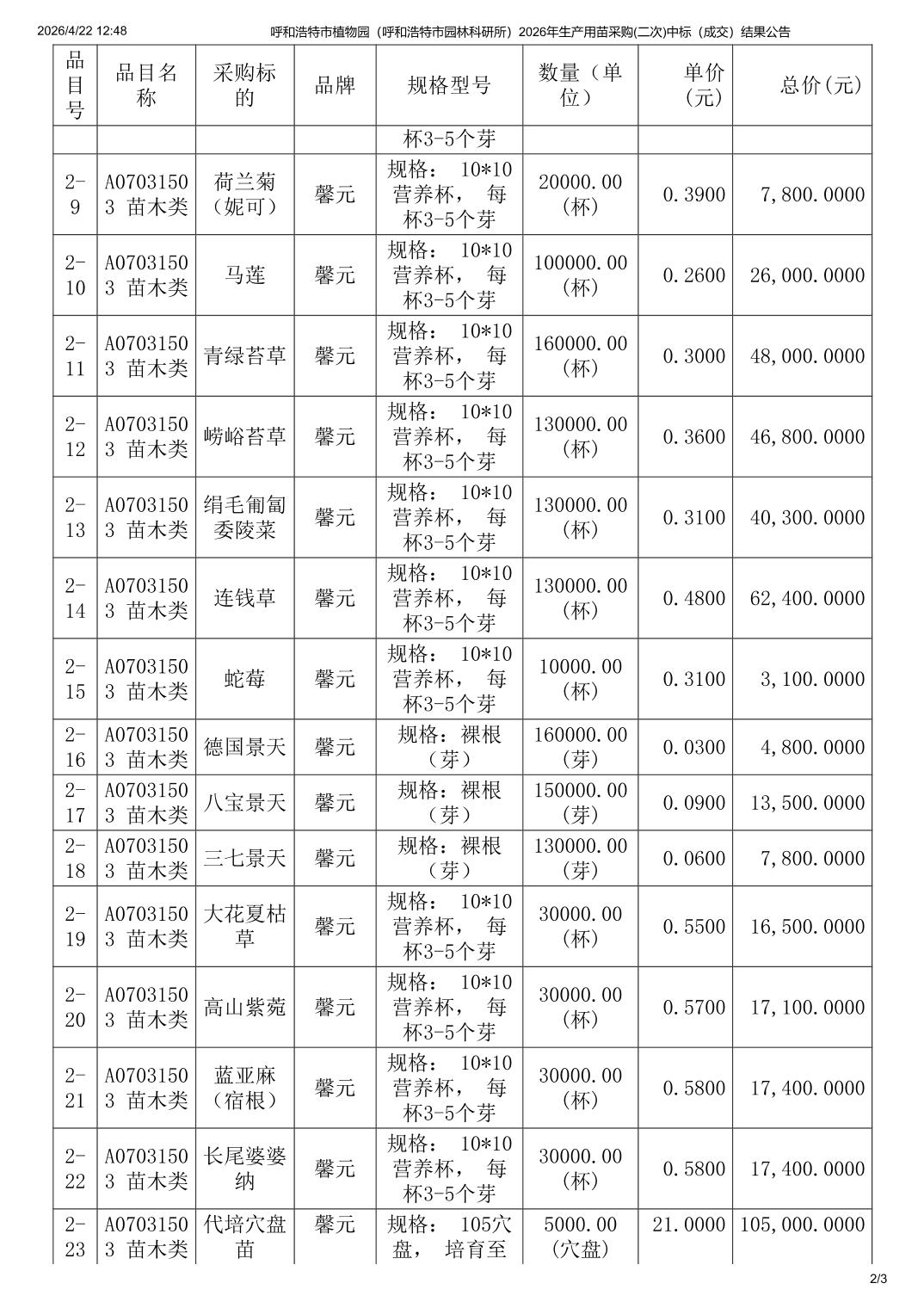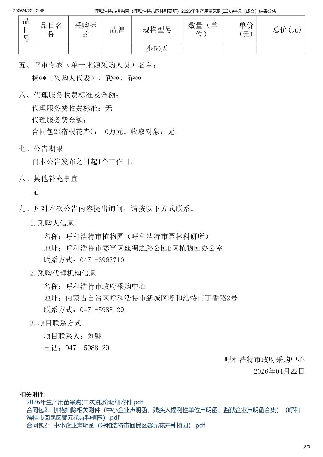 呼和浩特市植物园2026年生产用苗采购二次中标结果公告